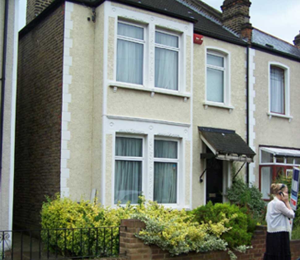 Back to pebbledash removalThis late Victorian/early Edwardian semi in Lee London SE12 is built of a mild yellow stock, decorated with red brickwork. After removal of pebble dash Mahon replaced 110 bricks to this brick façade all brick repairs are carried out with matching reclaimed bricks and lime mortar. The façade was pointed in ribbon style.
